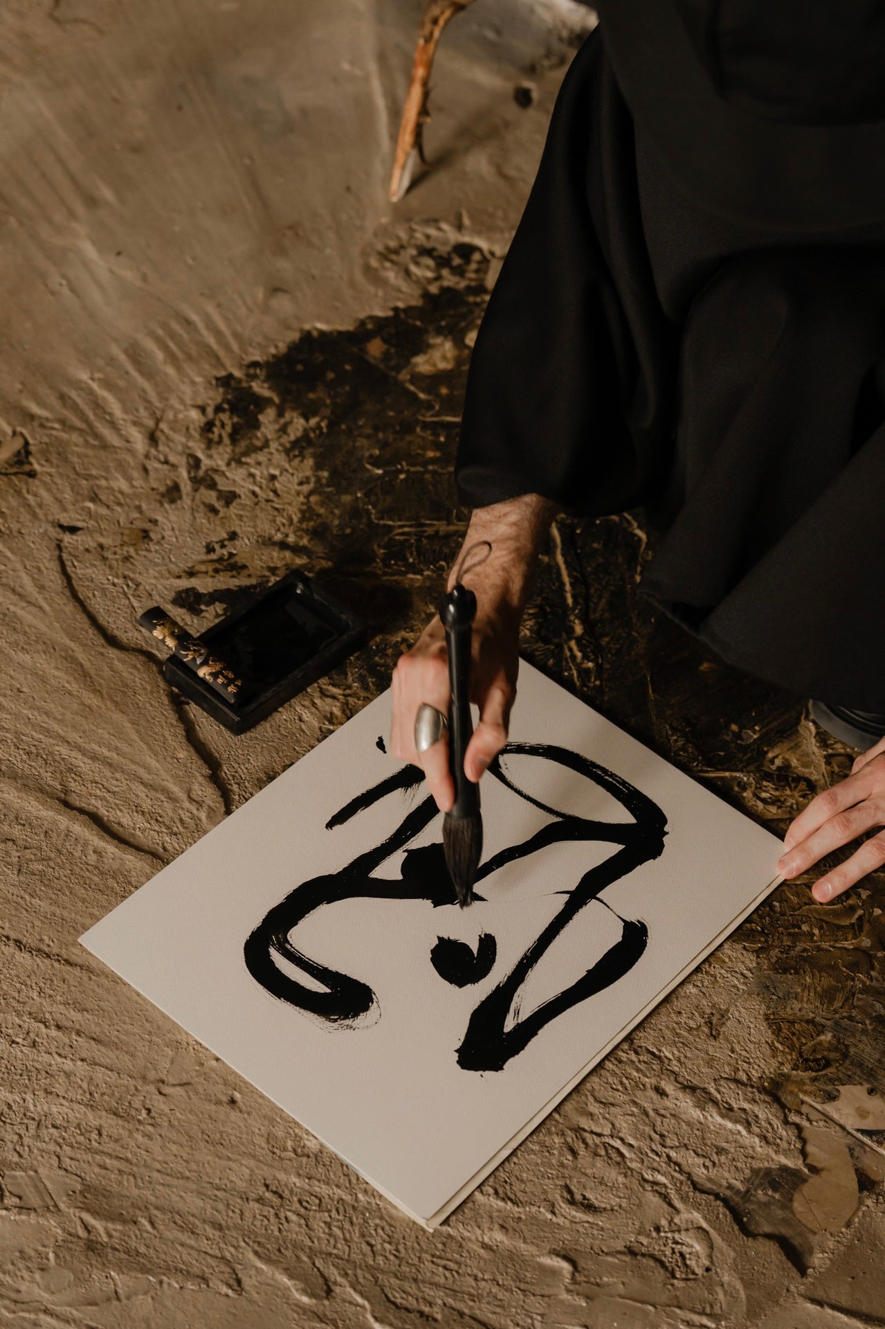 In his painting, the artist primarily uses Japanese ink, working on paper, canvas, and ceramics. His abstract compositions are built within a restrained, often monochromatic palette, dominated by black and white, enriched with organic tones obtained, among other methods, by staining the surface with tea leaf essence. Each work is a record of an intuitive gesture — a trace of concentration, breath, and decision made in the present moment. Kubaj’s practice reveals influences of Zen aesthetics, shodō calligraphy, and the idea of balance between expression and silence.