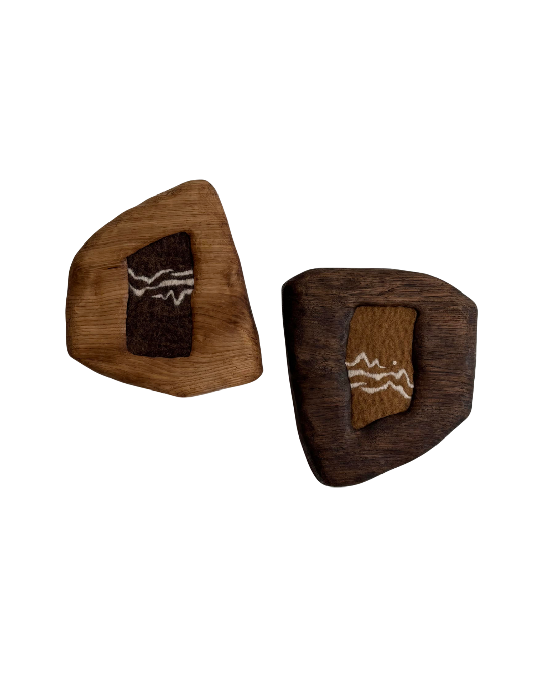 Naturally dyed and felted wool, embroidery with undyed wool yarn blended with silk, hand-carved, stained, and oiled oak wood.