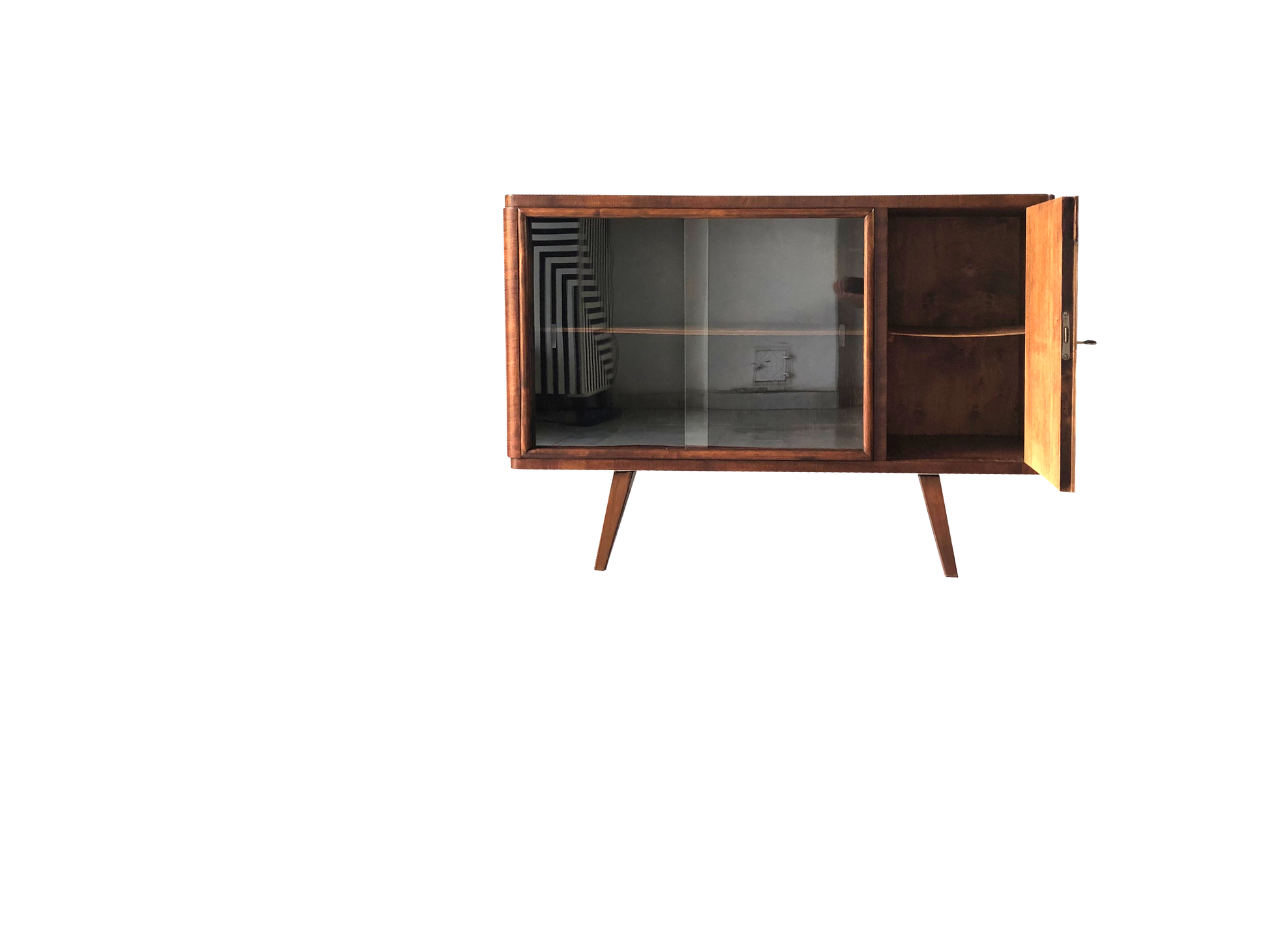 Po lewej stronie znajduje się część ekspozycyjna z drewnianą półką wewnątrz i przesuwanymi szklanymi drzwiami.