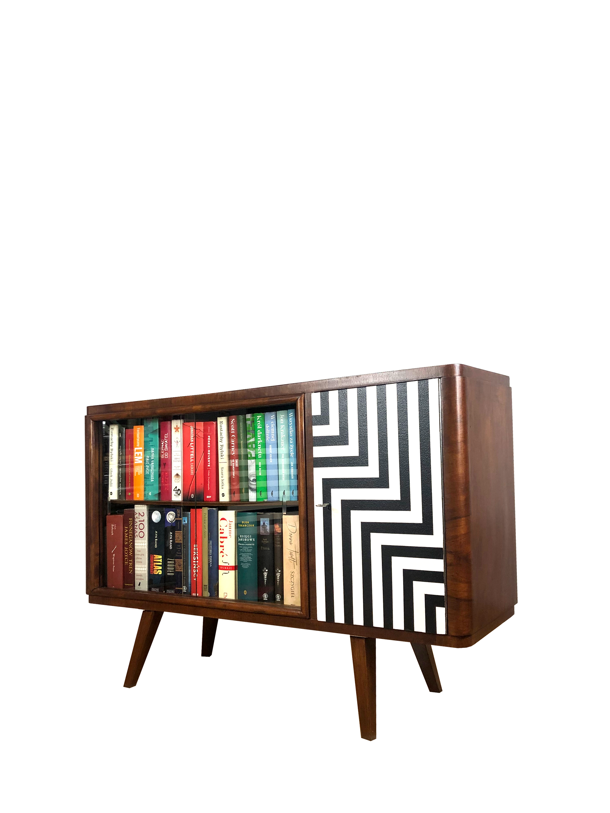 Po prawej stronie zamykana na klucz szafka; na drzwiach współczesny obraz inspirowany sztuką op-art, zaprojektowany i ręcznie namalowany przez www.czlowiekzkomodo.com .