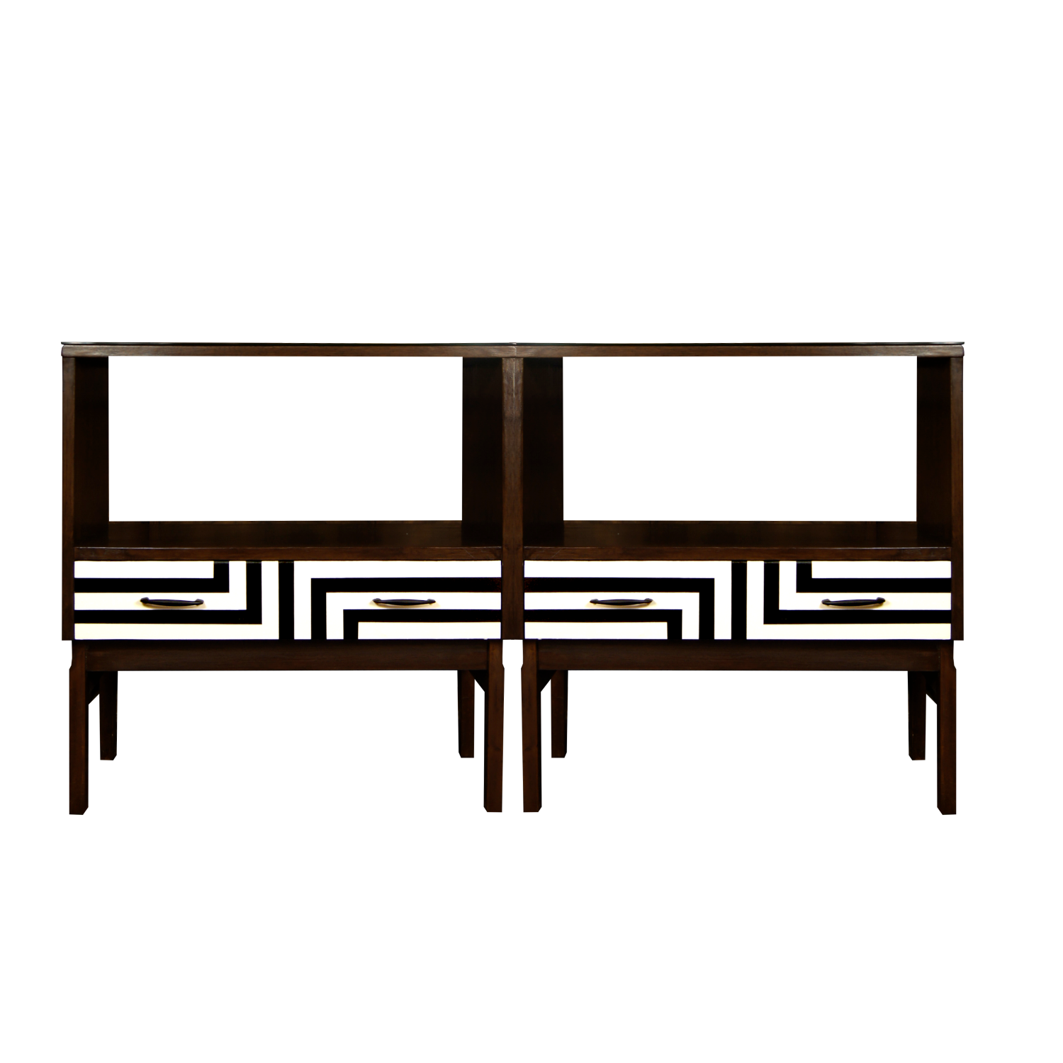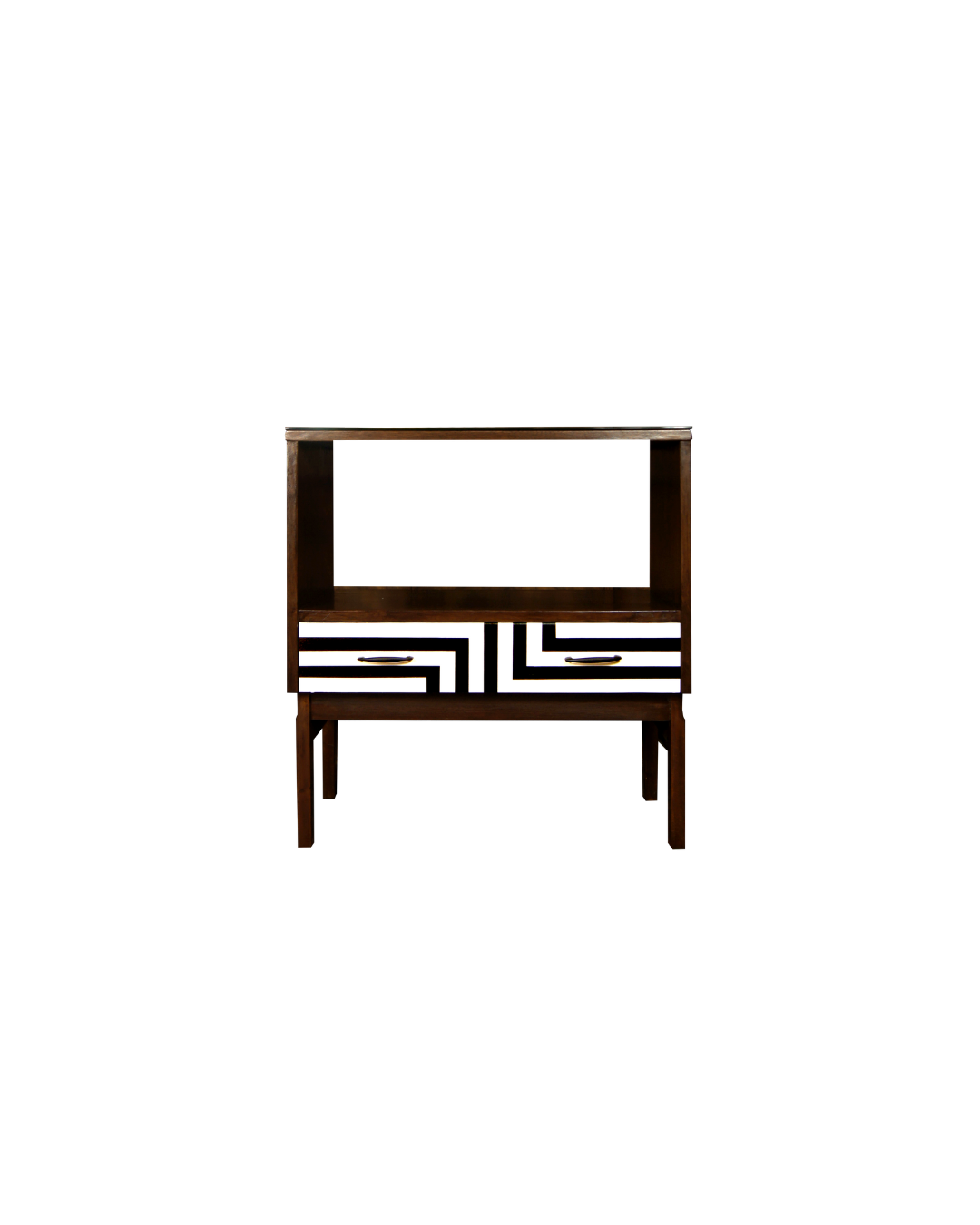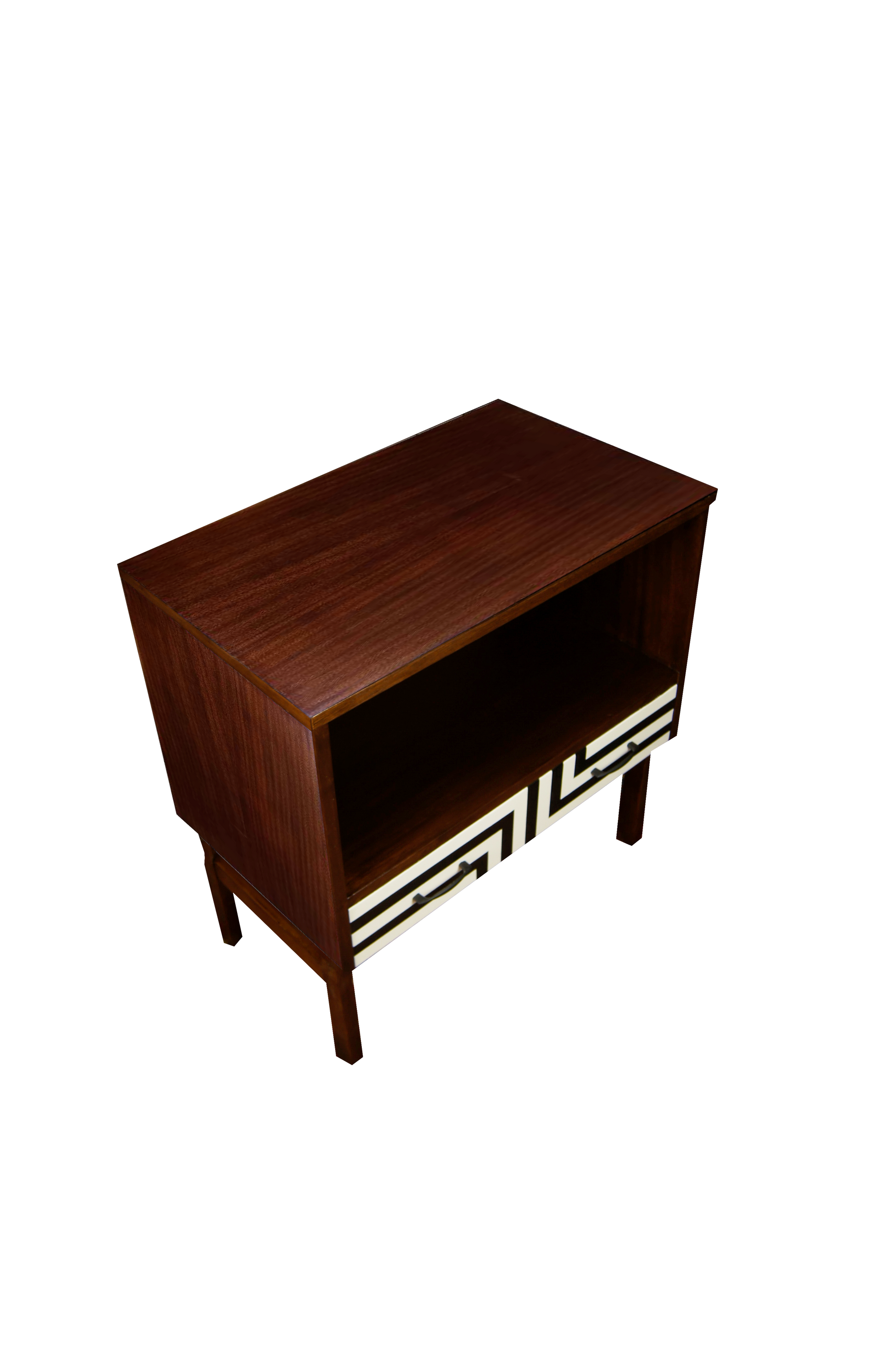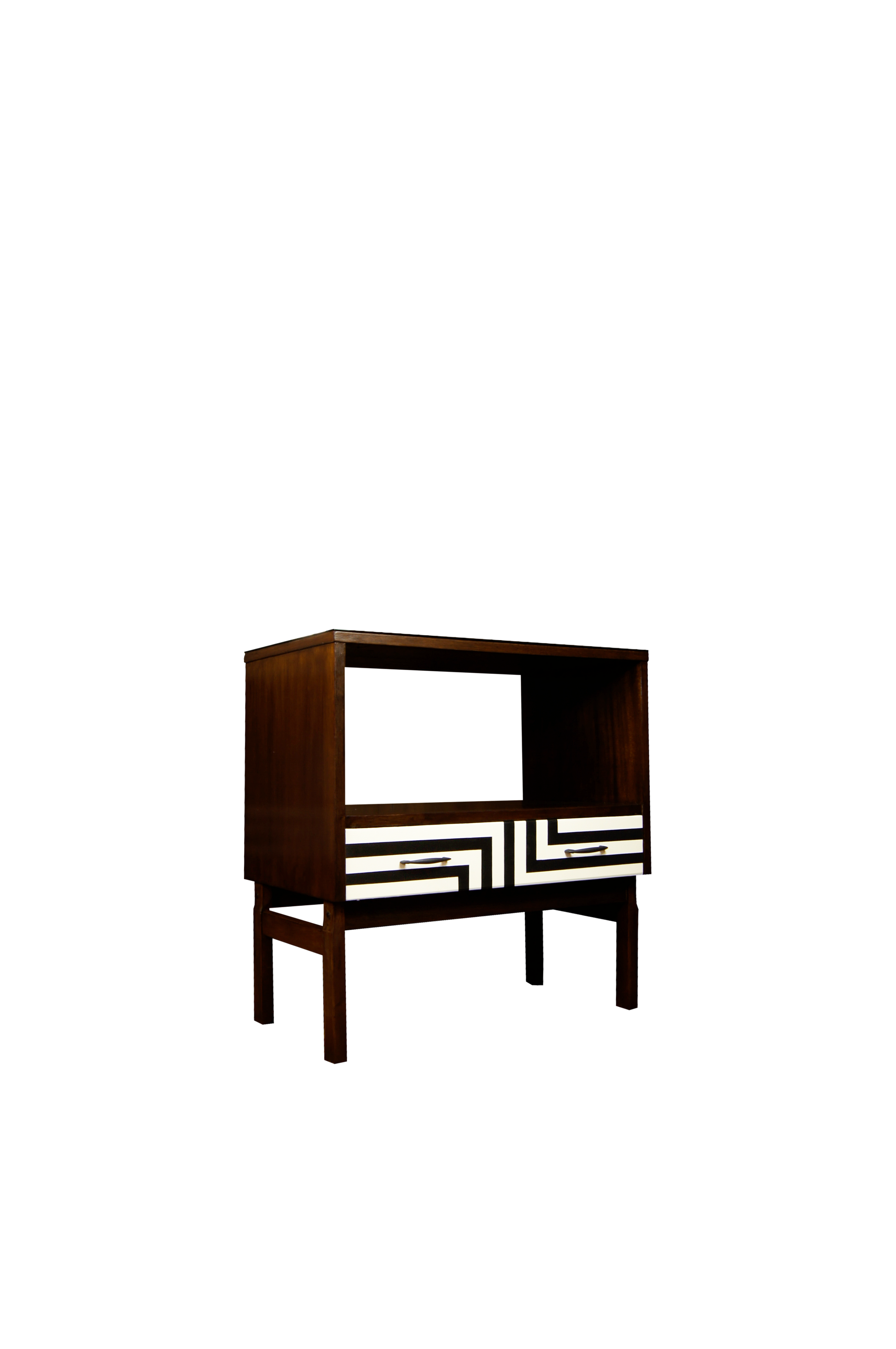 Przestronna szuflada ozdobiona jest ręcznie malowanym motywem op-art, wykonanym matową farbą akrylową.