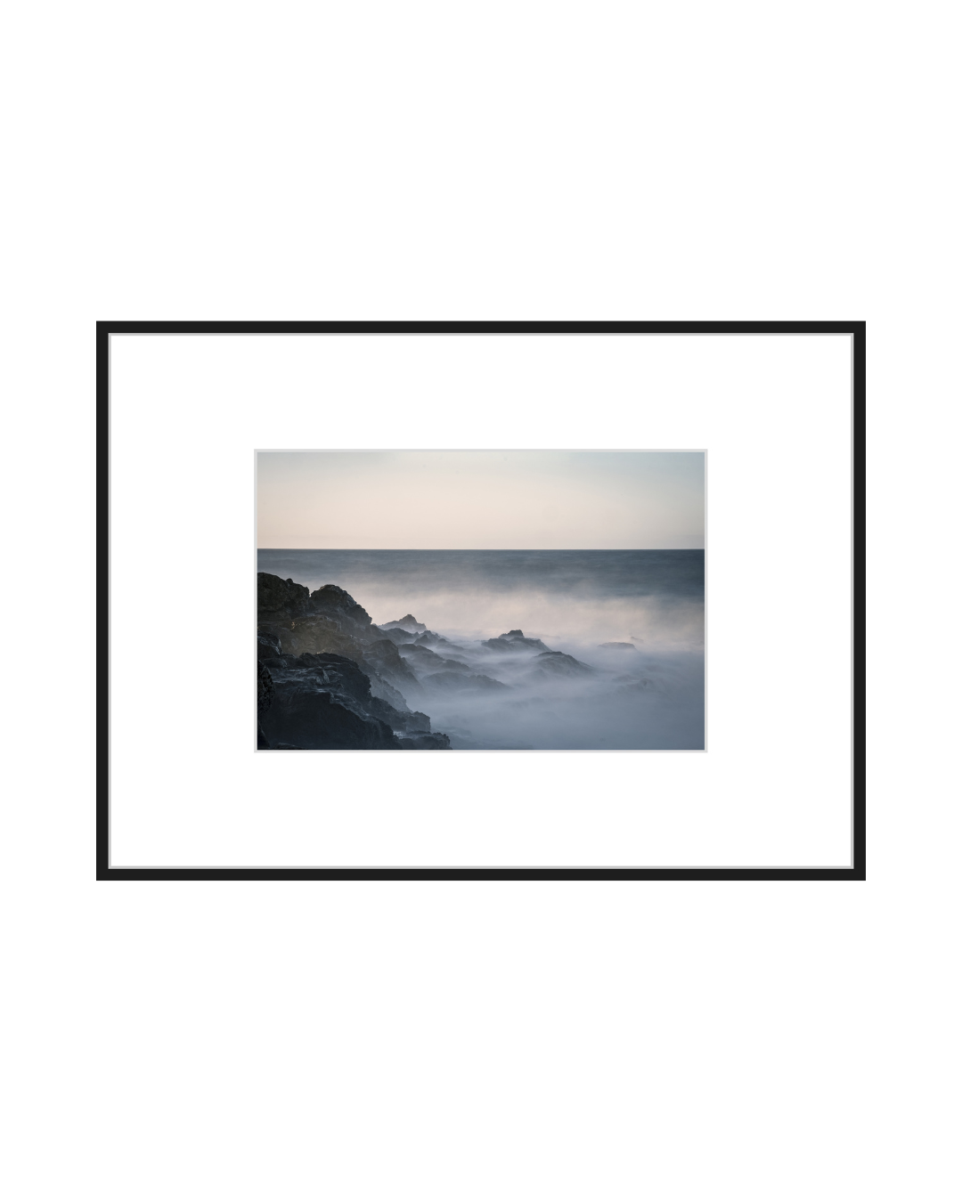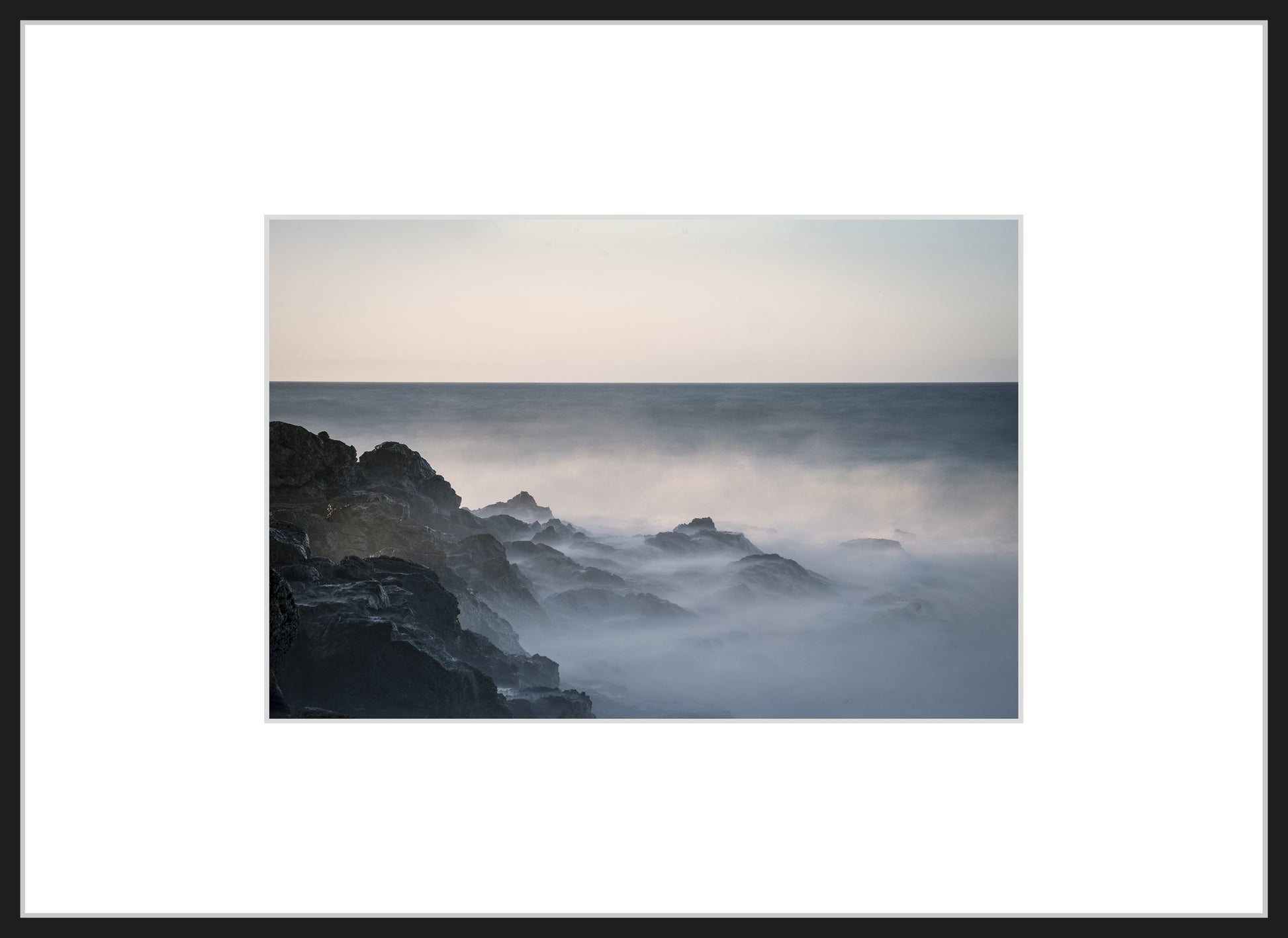 Zderzenie morza ze skałą rozpływa się w miękkiej, niemal eterycznej tafli mgły. Świadectwo morza poprzez jego ruch, zatrzymane w zawieszonej chwili, gdzie siła wody traci ciężar i treść. Zimne, stłumione tony zimowego świtu tworzą cichy, odległy krajobraz, w którym każdy szczegół za chwilę zniknie.