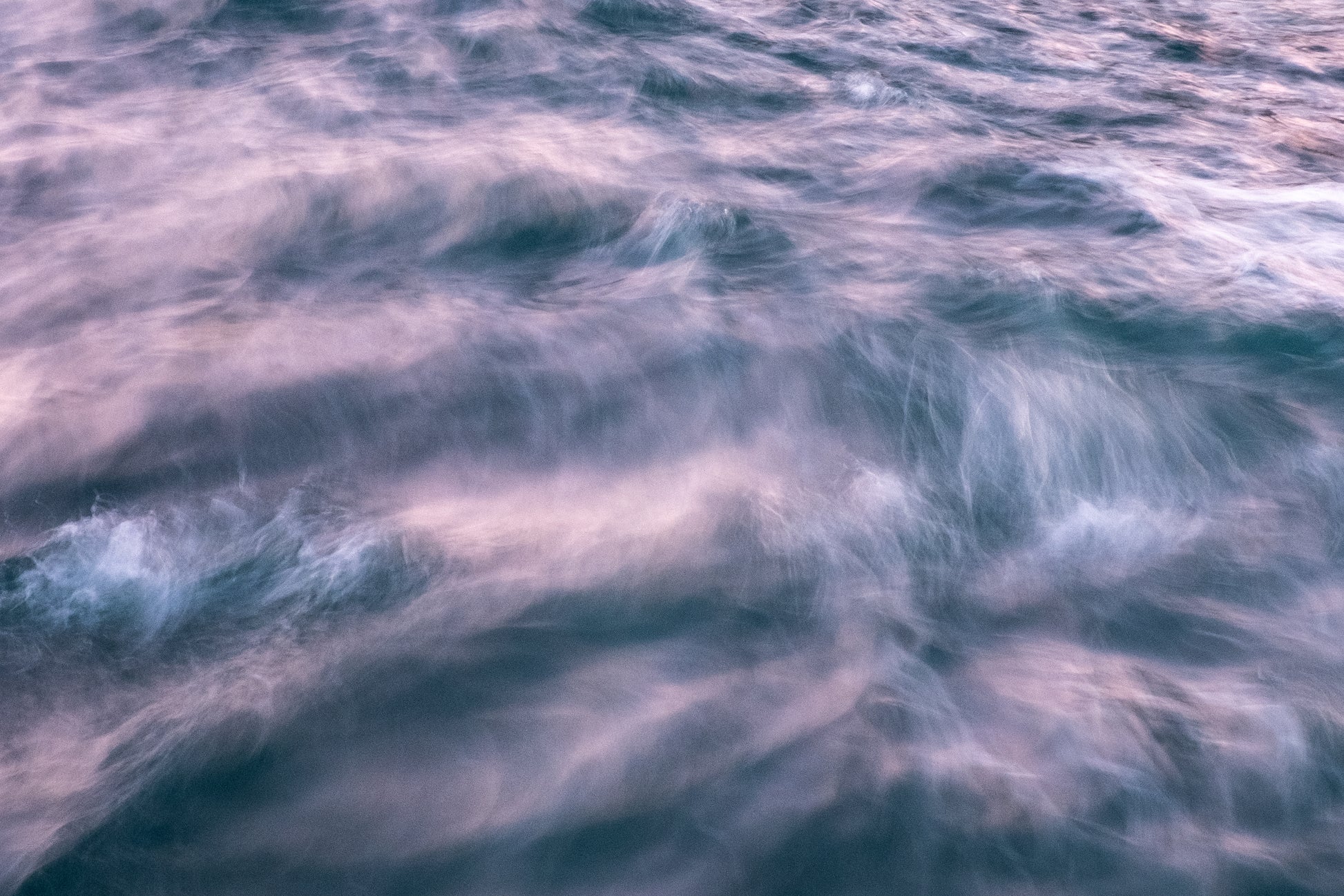 A close-up abstraction of moving water, where the sea dissolves into delicate streaks of color and motion. Light dances across the surface, breaking the texture into layers that resemble silk or smoke. The image is not a depiction but a suggestion—of movement, of breath, of continuity without form.