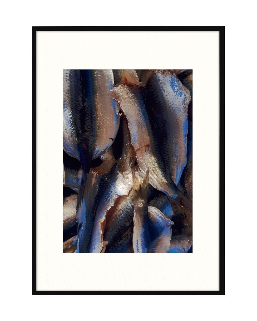 A shimmering mosaic of silver bodies, this photograph captures the tactile essence of sardines—an emblem of Sicilian culture and cuisine. Arranged in a rhythmic pattern, the fish reflect painterly hues of blue and steel, transforming an everyday scene into an intense visual texture. A tribute to skin, tradition, and Mediterranean identity.