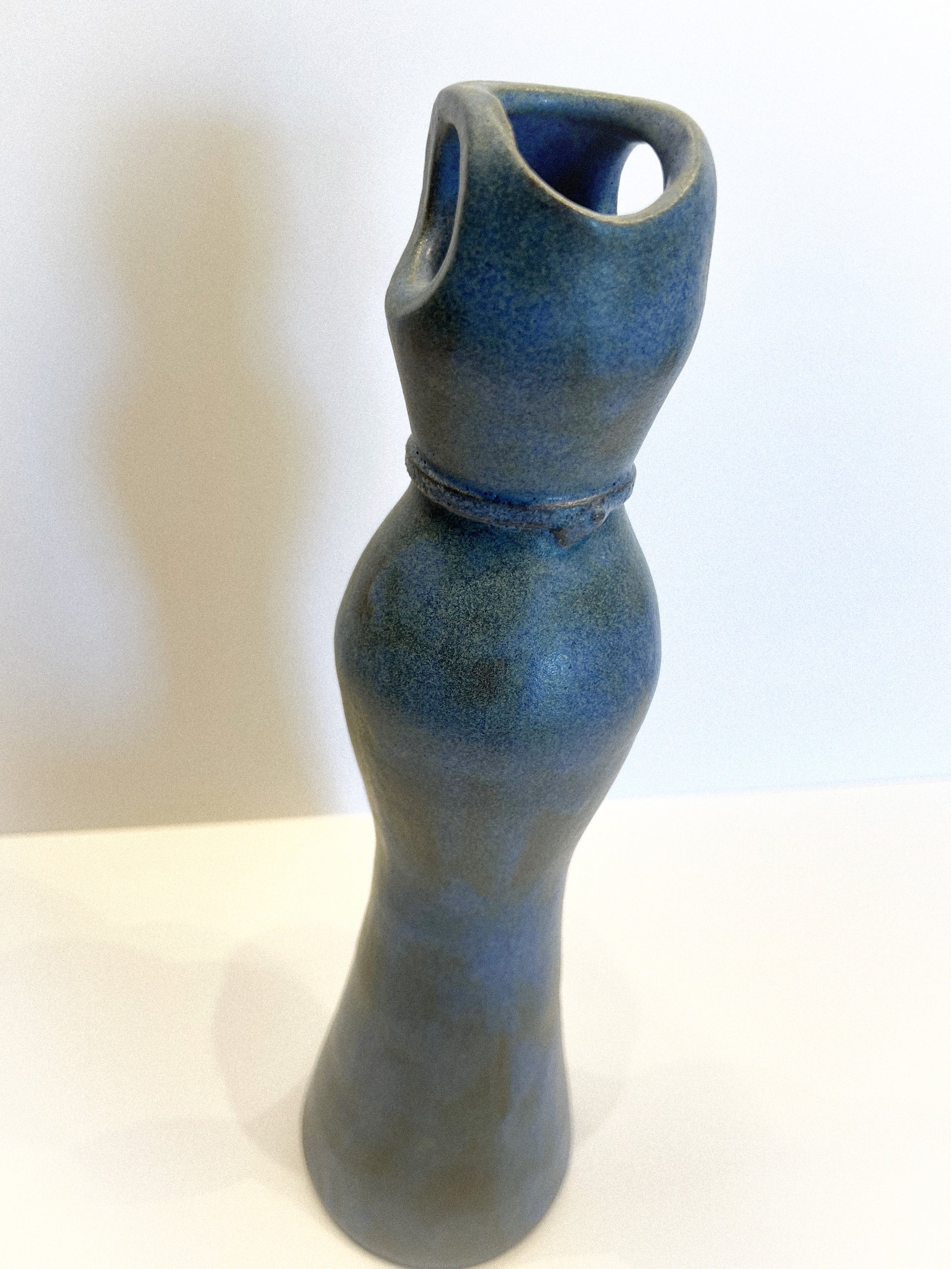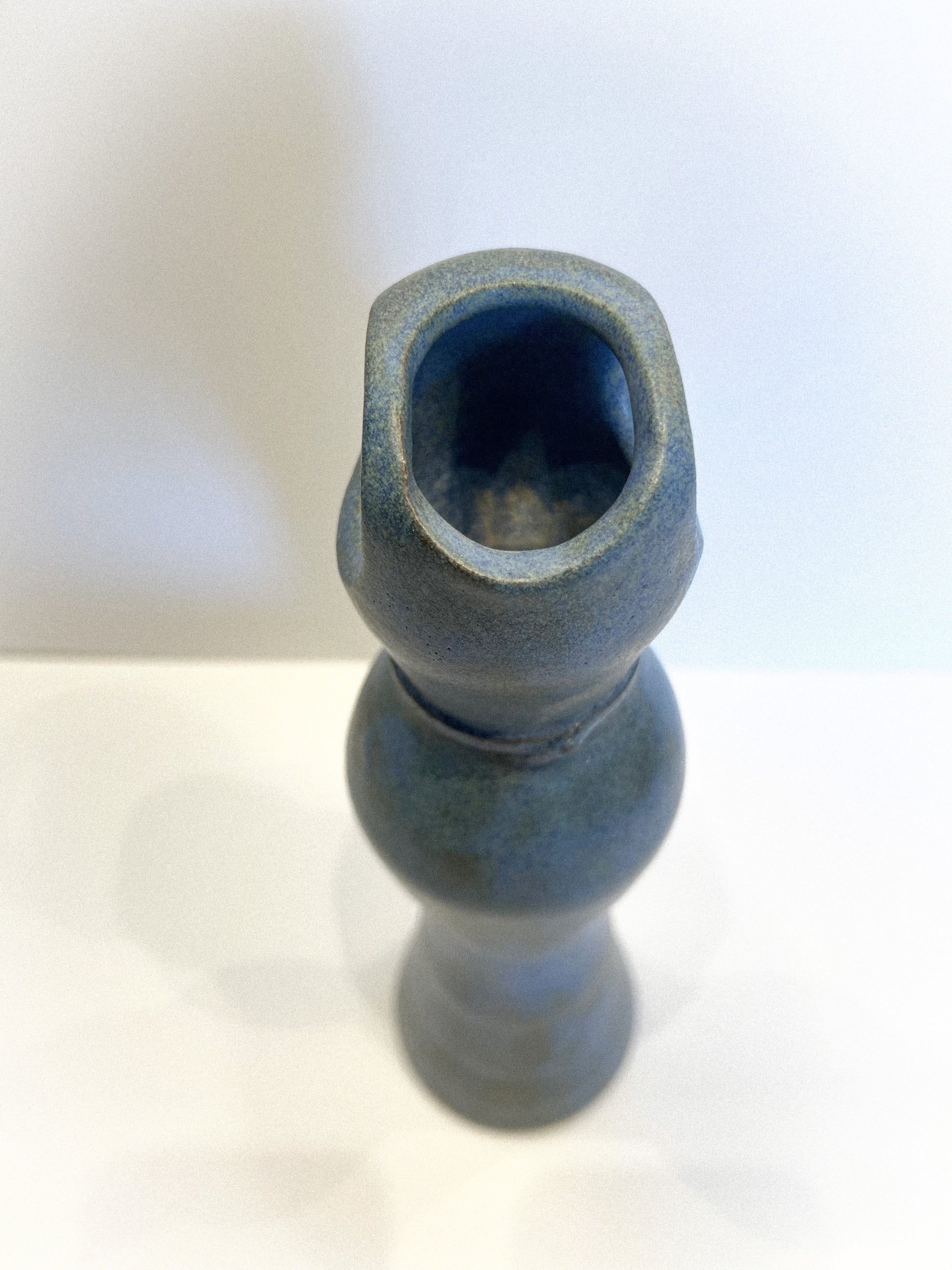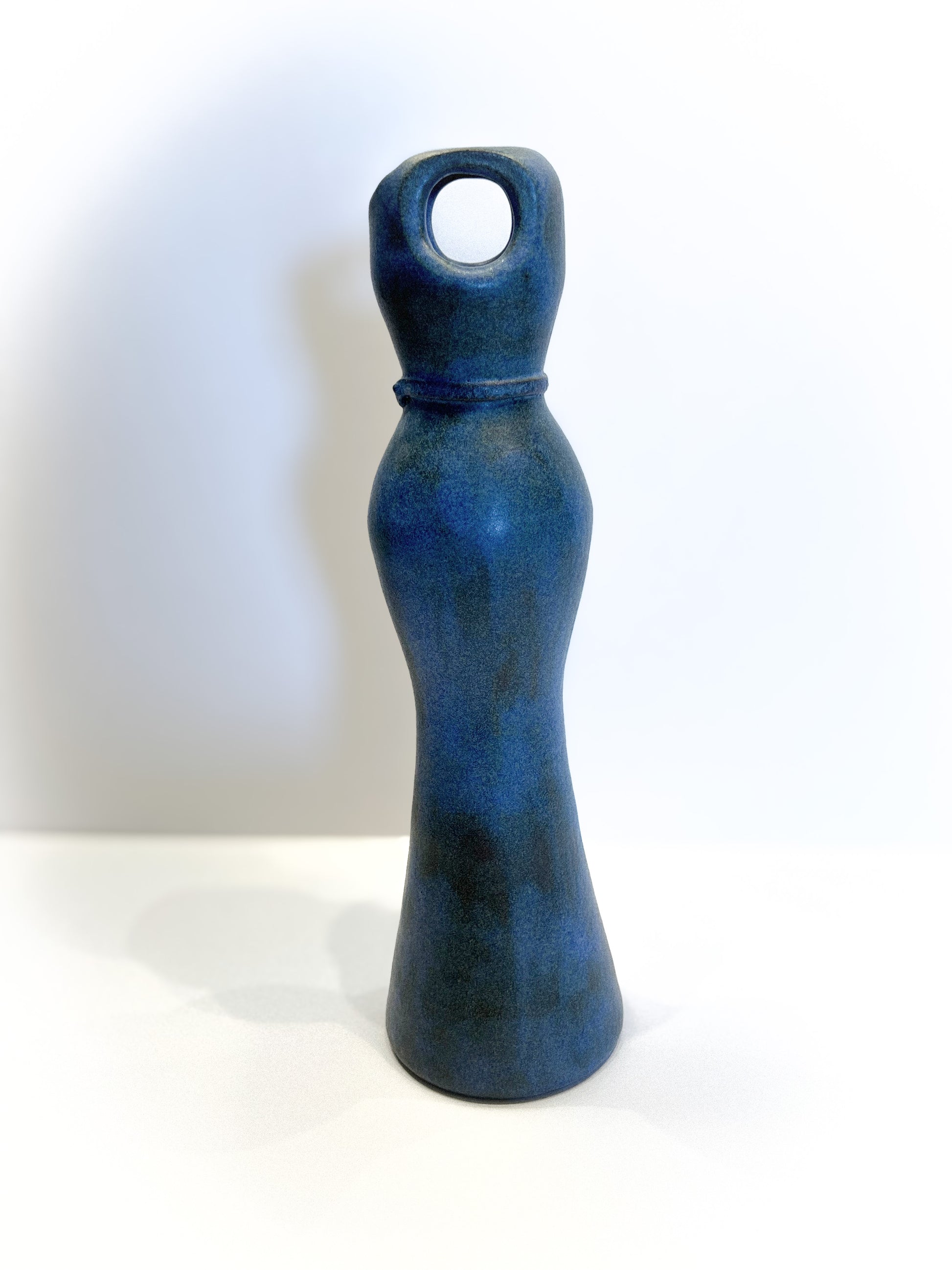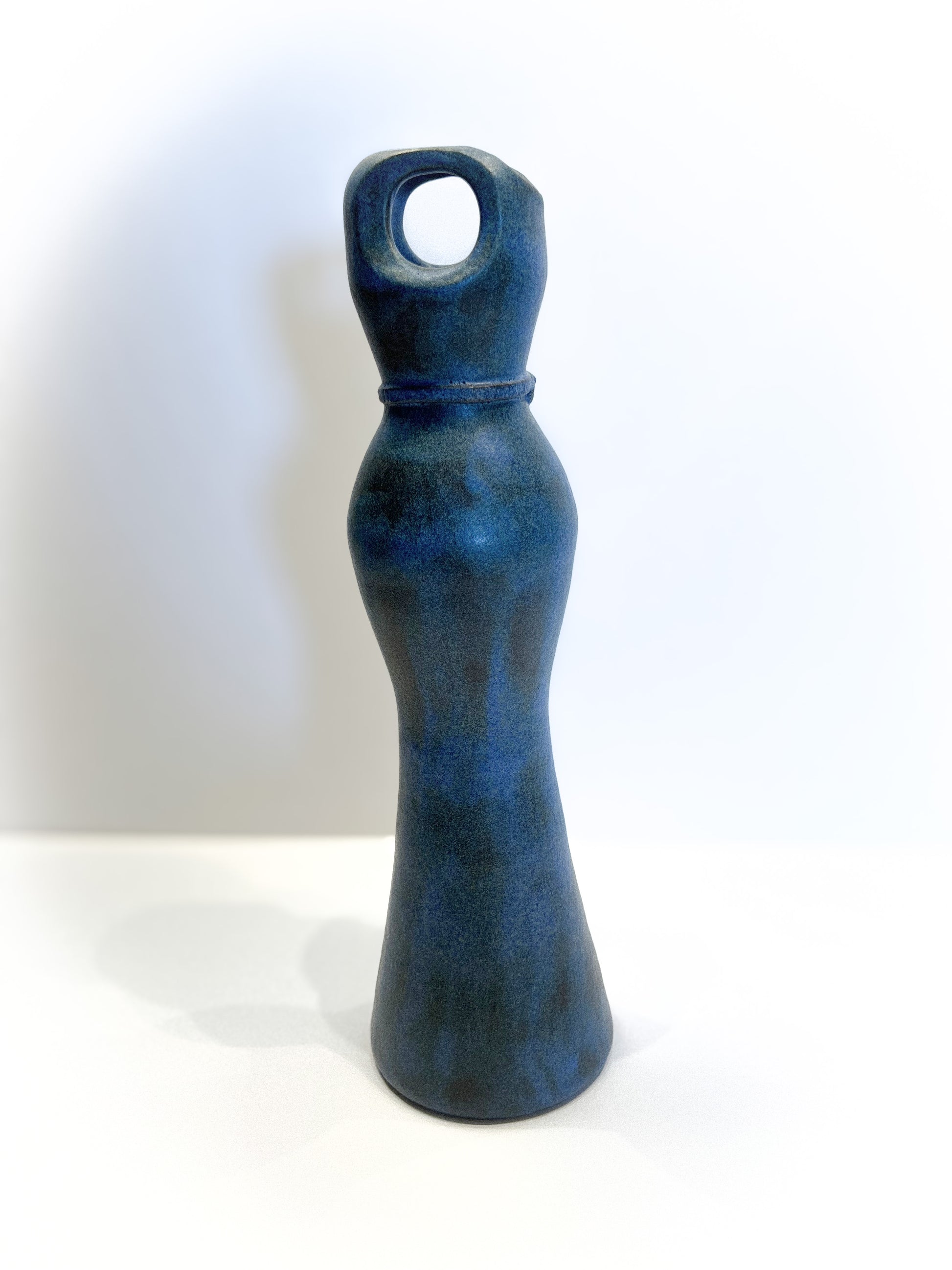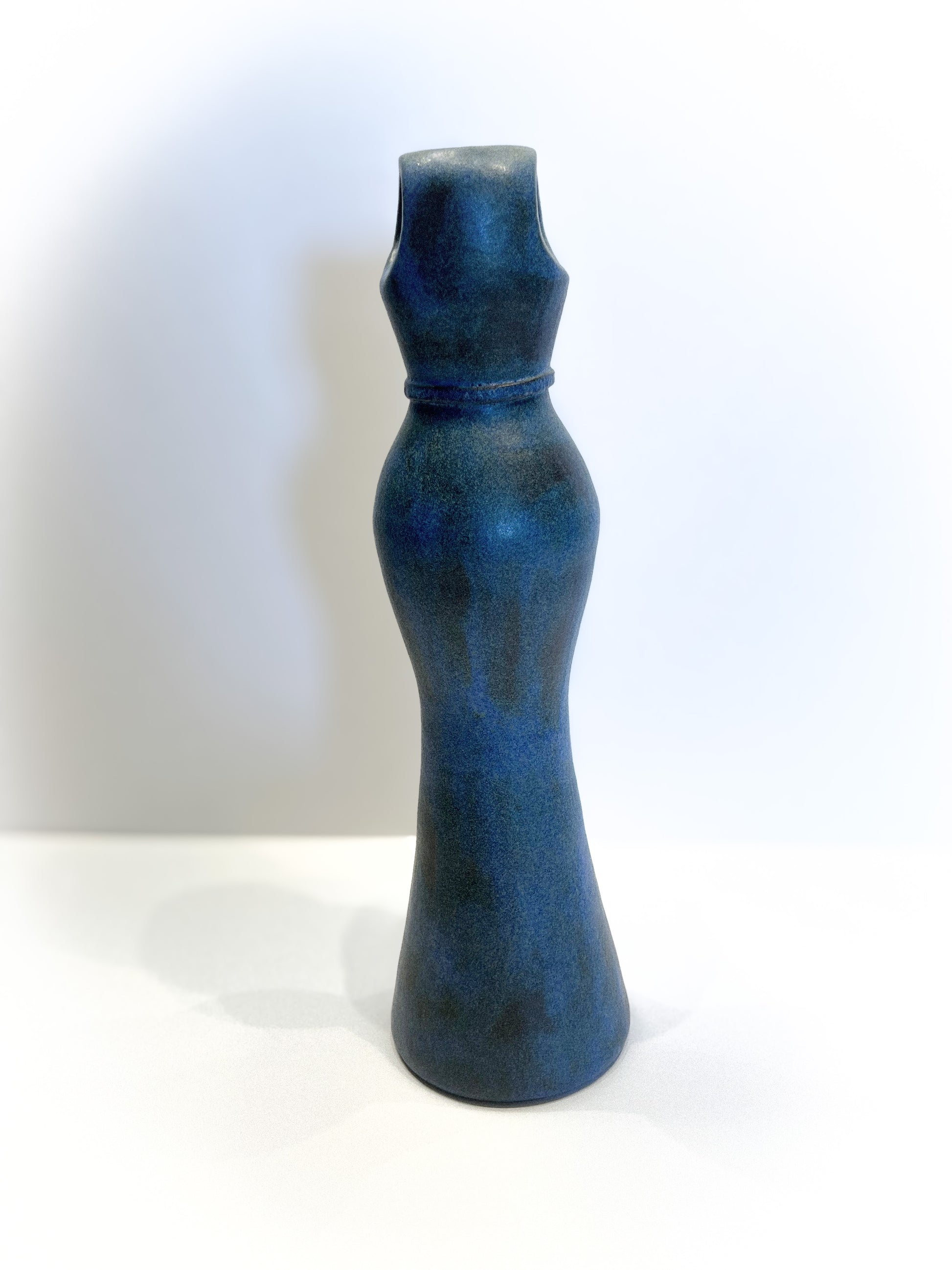 A ceramic sculpture that invites stillness and contemplation. Its hourglass silhouette, minimal detailing, and soft belt evoke a quiet presence—an abstracted body distilled to gesture and hue, where identity is felt more than seen. The surface, glazed in rich blue tones with subtle shifts in texture and tone, offers a sense of atmosphere as much as form. The absence of intricate detail draws the viewer in, encouraging imagination to fill in what is left unsaid. There’s a meditative balance in this piece—a harmony between tension and release, between what is hidden and what is hinted at. Blue Form is less a portrait than an echo. It holds space like a breath suspended in time—a suggestion of a figure, a memory softened by distance, a story not yet fully told.