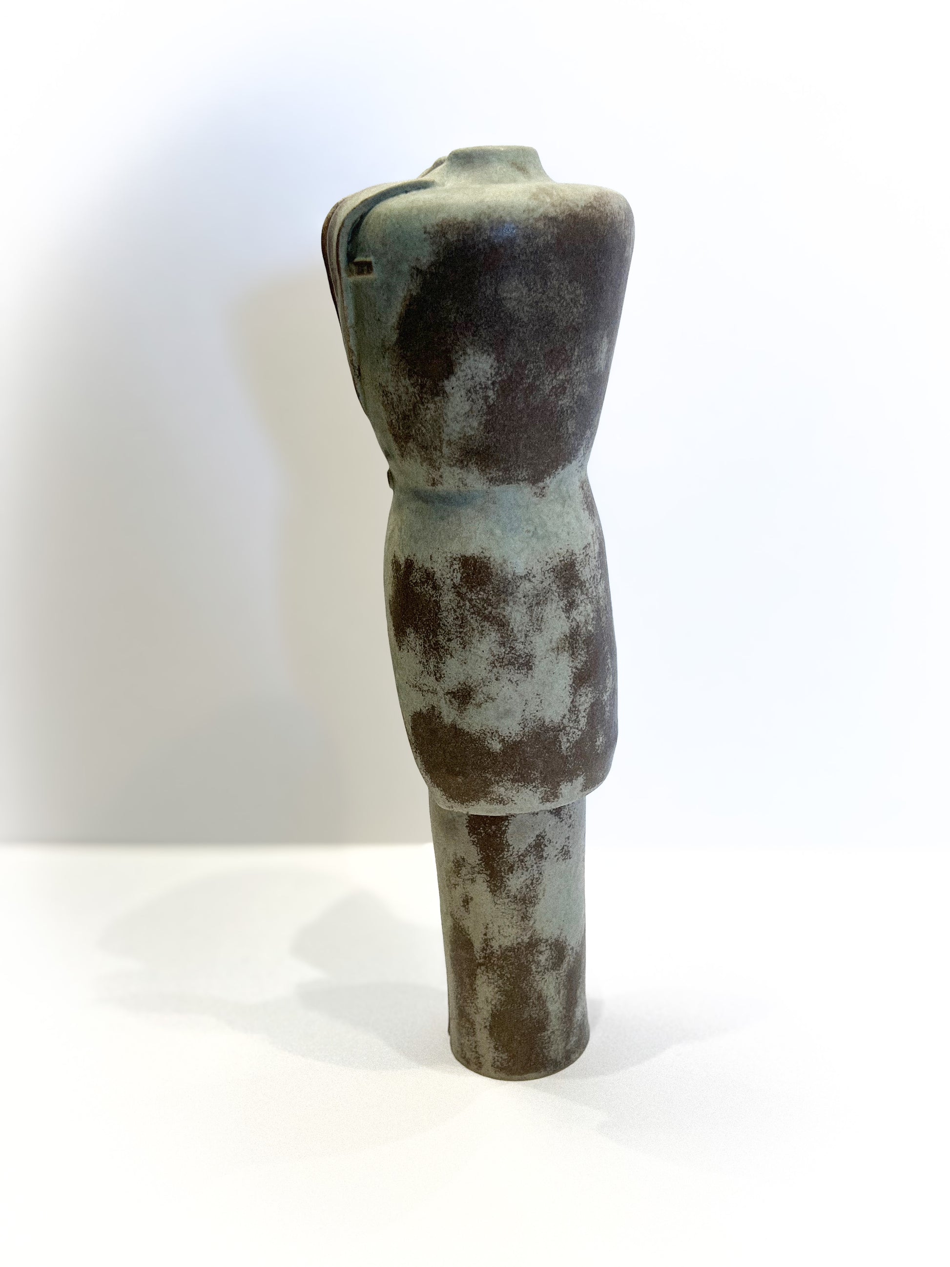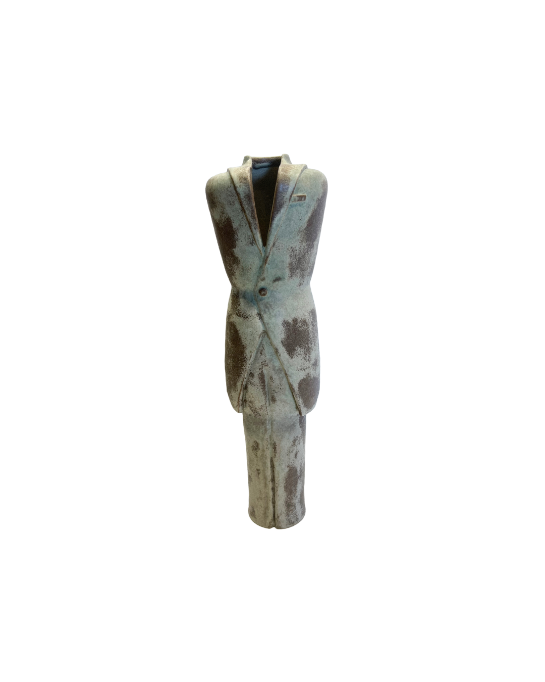 A ceramic sculpture that explores the erosion of status, the passage of time, and the vulnerability beneath the surface of control. The tailored suit—once sharp and commanding—is now faded, softened by wear and memory. The glaze, with its mottled patina and subtle discoloration, speaks of age and experience. The single button, the clean cut, and the empty collar hint at a figure who once stood tall—now only the garment remains. Worn Authority is a quiet monument to power undone. It asks what remains when the voice is gone, and only the outline of command is left behind. | Clay, Wheel Throwing, and Hand-Sculpting | 35.5 x 10.5 cm. | 2024