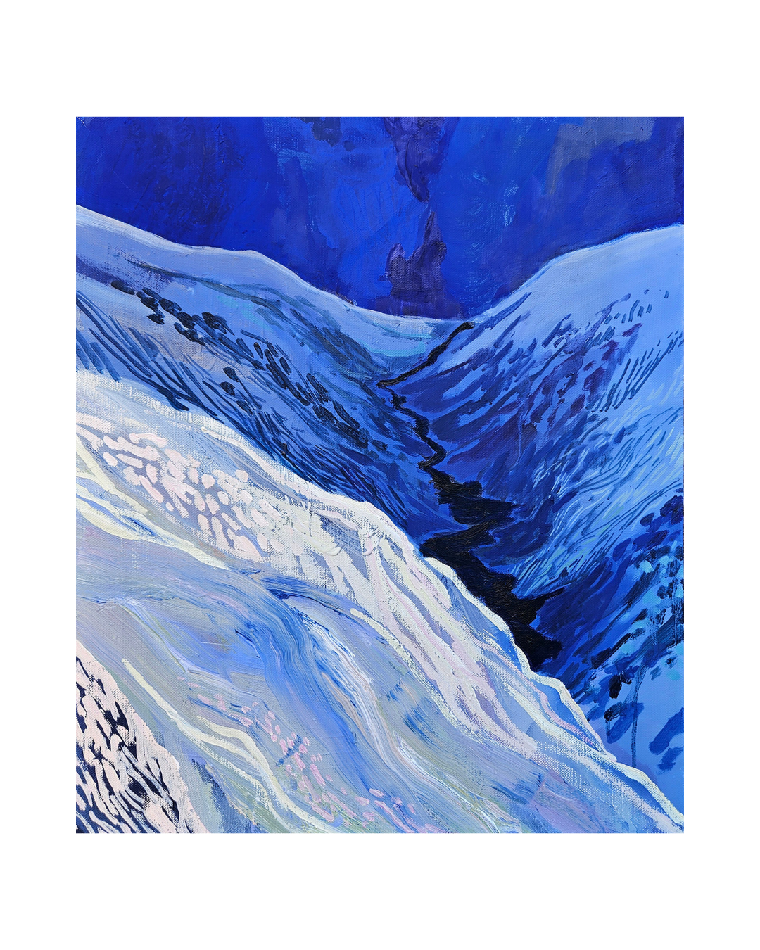 Because her paintings offer a sense of inner peace while quietly stirring something deeper—an awareness of the unseen. Because through archetypes like the mountain, moon, and horizon, she invites us into a symbolic world where nature becomes a mirror for the self. And because in her work, the boundary between human and nature gently dissolves—reminding us that we are never separate from the world, but always intricately woven into it.